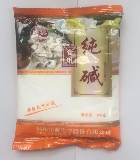 和面团时添加适量食用碱可增强面团劲力,改进面筋的物理性质,质地会变密、增强弹性和强度;使面团延伸或膨胀时不易断裂;面团组织紧密后,成品色泽会显得洁白,面团发酵时,可去除发面团的酸味。做面条时添加可使面条不易断裂更筋斗,面条食用时无酸味,保存时间更长。烹调肉类时添加适量食用纯碱,可缩短炖肉时间,使其容易变熟、软烂。适用于干货原料张发,软化纤维。